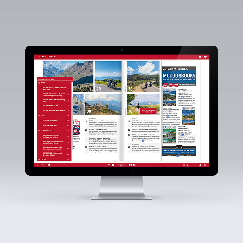 ALPENTOURER – dein Motorrad-Tourenmagazin – gibt es im attraktiven PLUSABO bei einer Laufzeit von 6 Ausgaben (1 Jahr) oder 12 Ausgaben (2 Jahre) mit deutlicher Ersparnis gegenüber dem Einzelkauf und vielen weiteren Vorteilen! Du erhältst die gedruckten Ausgaben zum Vorzugspreis frei Haus. Und dazu alle Ausgaben im Abozeitraum auch als E-Paper für digitales Lesevergnügen unterwegs. Zu deinem PLUSABO gehört neben dem E-Paper auch noch das ALPENTOURER Flipbook (weitere Infos im Reiter oben): online lesen und auf zusätzliche Inhalte sowie viele attraktive Funktionen zugreifen können!