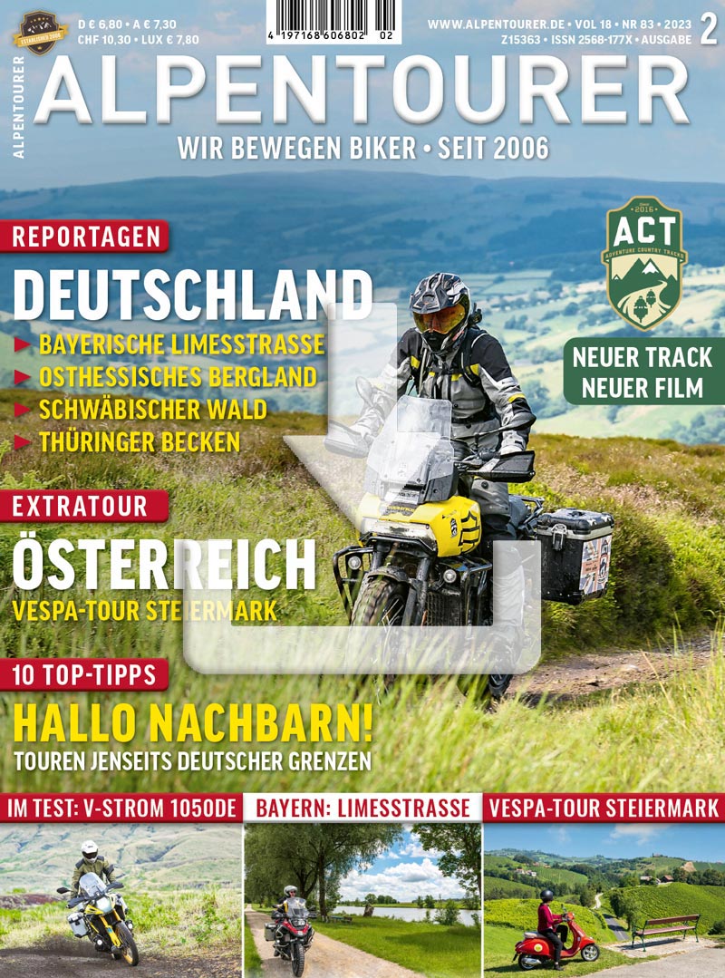 MOTORRADLAND DEUTSCHLAND steht im Mittelpunkt dieser Ausgabe von ALPENTOURER. Unsere Autoren geben Anregungen zu Touren am Bayerischen Limes, im osthessischen Bergland, im Kulturland Thüringen sowie im Schwäbischen Wald. Herrlich entschleunigt geht es bei einer Vespa-Tour durch die Steiermark zu. Und wir stellen die neue Suzuki V-Strom 1050DE in einem detaillierten Fahrbericht vor.