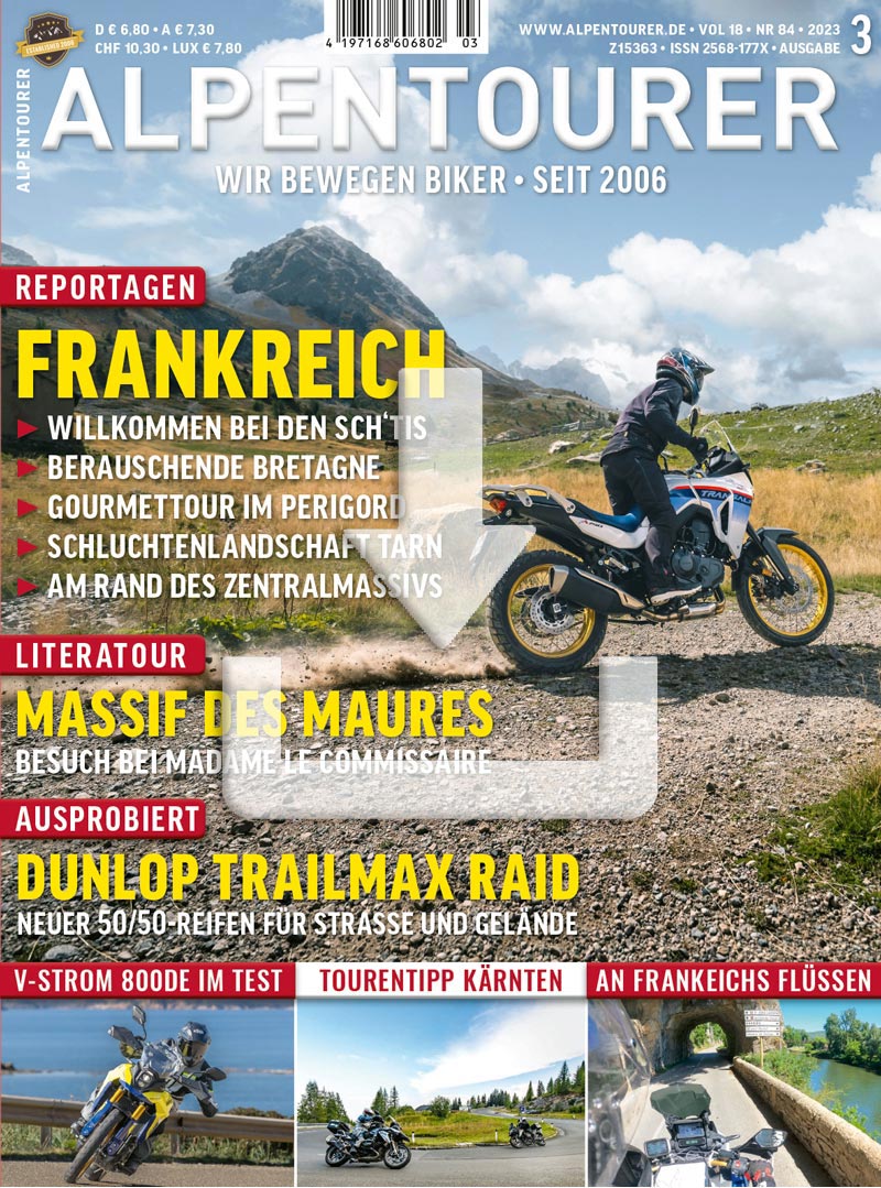 FRANKREICH steht im Mittelpunkt dieser Ausgabe von ALPENTOURER. Unsere Autoren liefern ein halbes Dutzend Anregungen zu Touren an der Opalküste, in der Bretagne, im Perigord, den Schluchtenlöandschaften des Tarn sowie entlang der Ufer des Lot am Rande des Zentralamssivs. Kriminell gut geht es bei einer LiteraTour durch das Massif des Maures zu. Und wir stellen die neue Suzuki V-Strom 800DE in einem detaillierten Fahrbericht vor.