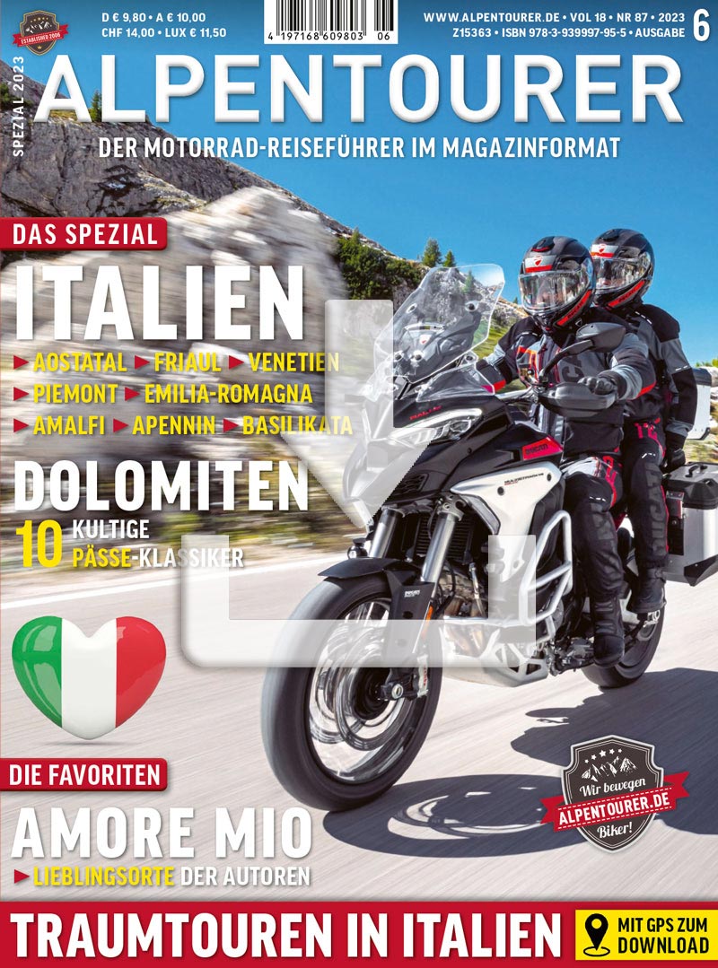 ITALIA, AMORE MIO – Das nun schon dritte ALPENTOURER SPEZIAL zum beliebten Motorrad-Reiseziel Italien deckt mit viel Liebe zum Detail vor allem den Alpenraum umfassend ab. Vom Aostatal ins Piemont, von den Dolomiten über Venetien bis ins Friaul – die Berge und ihre Prachtstraßen sind ein zentrales Thema der enthaltenen Reportagen. Kultur und Kulinarik werden danach in der Emilia-Romagna „erfahren“. Und mit der Region rund um Neapel, dem Vesuv sowie der Amalfiküste steht ein ganz besonderes Highlight an. Die Basilikata im tiefen Süden des Stiefels rundet einen weiteren unserer Motorrad-Reiseführer im Magazinformat dann trefflich ab.