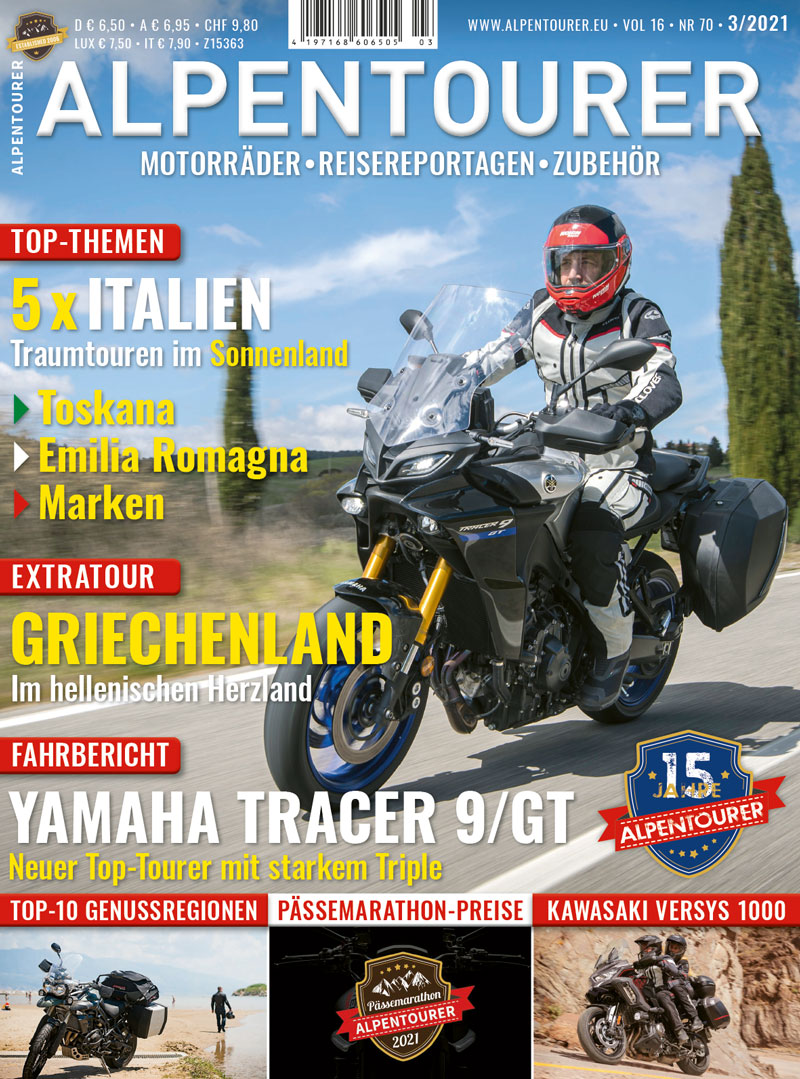 Damit aber nicht genug! Es gibt noch faszinierende Fahrberichte zur umfangreich überarbeiteten Yamaha Tracer 9 sowie zur Kawasaki Versys 1000. Und stöbert doch mal durch unsere Top-10 Genussregionen. Außerdem stellen wir euch die wertvollen Preise vor, die ihr beim Pässemarathon 2021 gewinnen könnt.