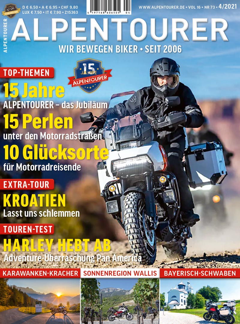 Damit aber nicht genug! Es gibt überraschende Erkenntnisse aus einem ersten Fahrbericht zur Harley-Davidson Pan America 1250. Und aus unseren Top-10 wird anlässlich das 15-Jährigen Jubiläums eine TOP-15 der schönsten Redaktionsfavoriten unter Europas Motorradstraßen. Zusätzlich stellen wir euch 10 Glücksorte für Motorradfahrer vor – mit feinsten Fotos, unter anderm vom Herausgeber des Curves-Magazin Stefan Bogner. Im Jubiläums-Special schließlich werfen wir einen Blick hinter die Kulissen von ALPENTOURER und stellen euch unser internationales Autorenteam einmal näher vor.