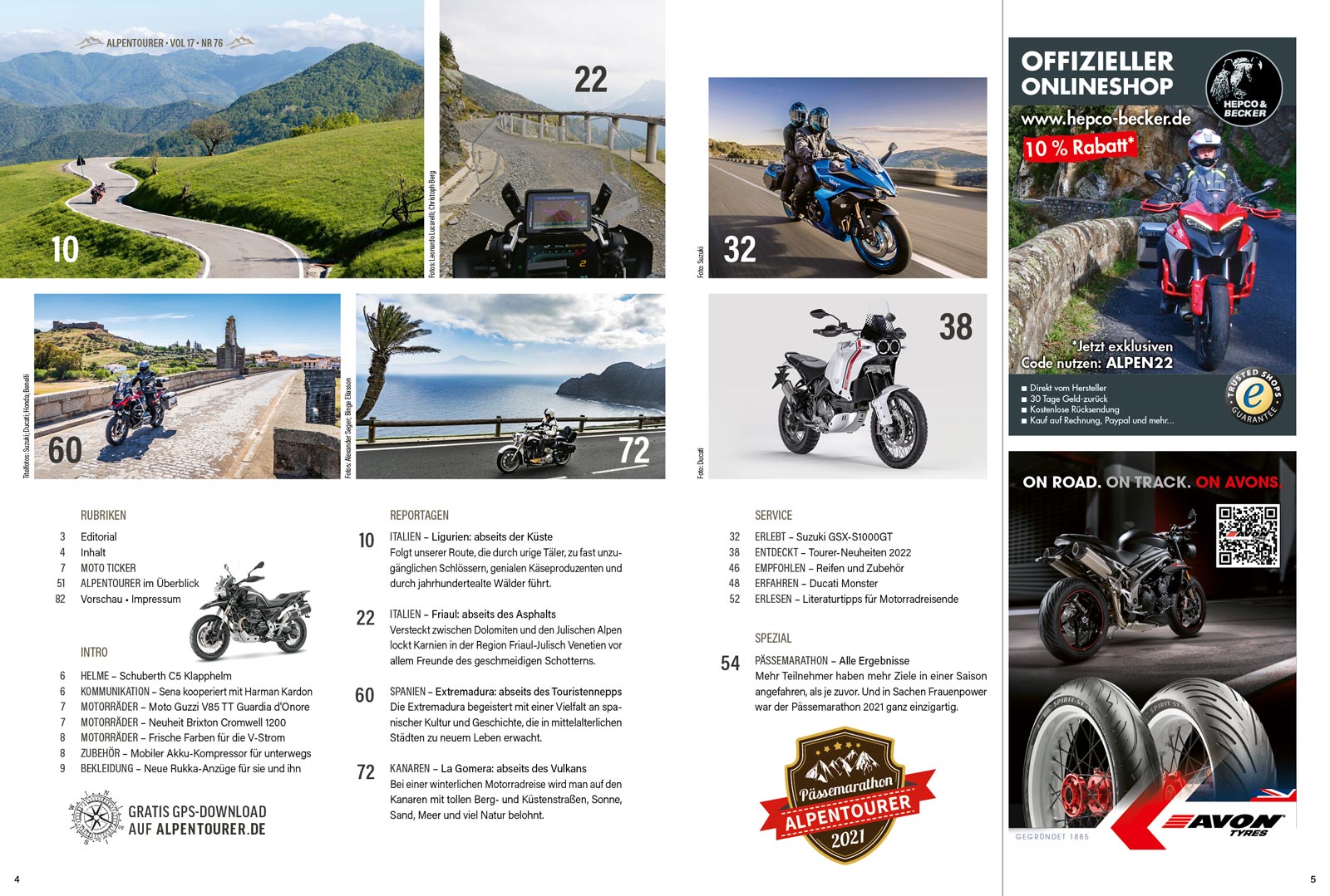 Das alles und noch viel mehr findet ihr in ALPENTOURER 1/2022. Am besten, ihr seht selbst: im Reiter "Inhalt" oder in der Abbildung der Inhaltsseiten oben …