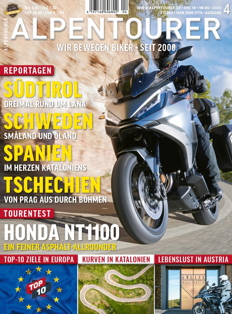 Unser internationales Autorenteam liefert in dieser Ausgabe von ALPENTOURER eine Handvoll Anregungen zu Touren in EUROPA. Es geht nach Schweden und nach Tschechien, in die spanischen Pyrenäen sowie nach Südtirol. Außerdem begeistern wir uns und euch mit Erlebnissen auf der steirischen Straße der Lebenslust. Und die aktuelle Honda NT1100DCT beweist sich in einem ausgedehnten Tourentest.
