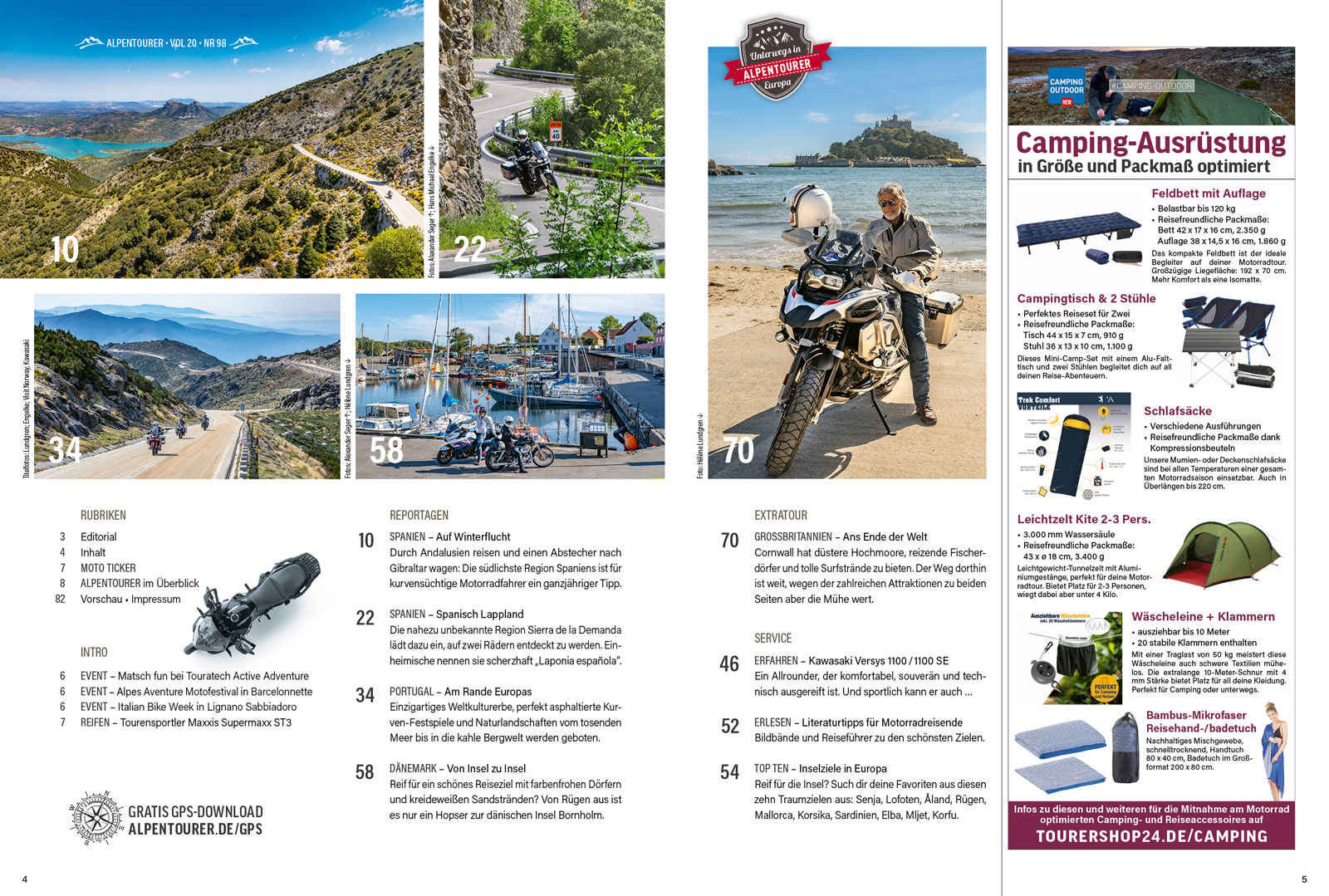 Die Tour-Reportagen in ALPENTOURER 5-2025 sind Balsam für alle, die reif für eine Insel sind: Wie wäre es denn mal mit der dänischen Ostsee-Perle Bornholm? Oder mit einem Trip nach Cornwall bis ans Ende der brtischen Inselwelt? Wem das nicht genügt: eine vielfältige Insel-Auswahl steht in den Top-10 bereit. Und bald werden die Nächte wieder kürzer, die Tage kühler. Grund genug, sich nach geeigneten Winterzielen umzusehen. Das machen wir: gleich zwei Mal in Spanien sowie in Portugal.