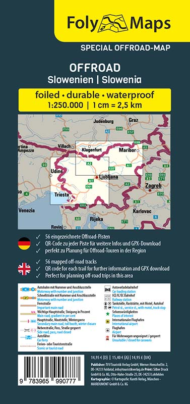 Die FOLYMAPS Offroadkarte zu Slowenien vereint 56 Tracks auf einer Übersichtskarte im Maßstab 1:250.000. Mit QR-Codes zum Gratis-Trackdownload.