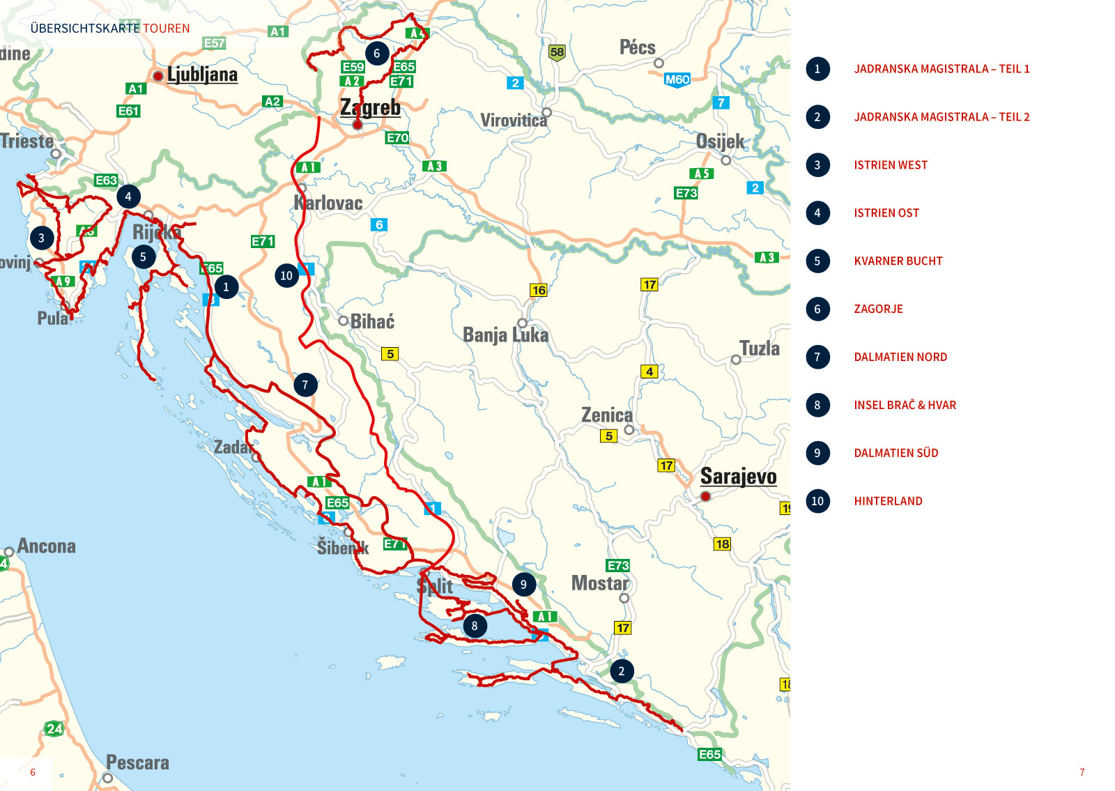 Die blau-schimmernde Adria ist schon seit Jahrzehnten einer der Sehnsuchtsorte deutscher Urlauber. Mittlerweile hat sich herumgesprochen, dass Kroatien auch ein mehr als perfektes Bike-Revier bietet. So kann man auf der Jadranska Magistrala, der noch zu Titos Zeiten angelegten Küstenstraße, auf fast 1.000 Kilometern von Norden nach Süden cruisen – gerne mit Inselhopping auf das eine oder andere der angeblich mehr als 1.000 Eilande des Landes. Dazu kommt das spannende Hinterland mit grandiosen Serpentinenstraßen und spektakulären Nationalparks.