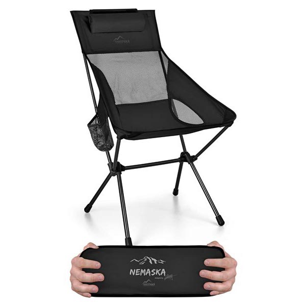 Der Campingstuhl Nemaska lässt sich trotz größerer Sitzhöhe und breiterer Sitzfläche dank seines kompaktes Packmaßes ganz leicht am Motorrad mitnehmen. Dem geringen Eigengewicht steht eine stolze Traglast von 170 Kg gegenüber. In der flexiblen Aufbewahrungstasche mit Tragegriff lässt sich der Stuhl leicht verstauen. Mit seiner Sitzhöhe von 39 cm steht er einem klassischen Faltstuhl in nichts nach.