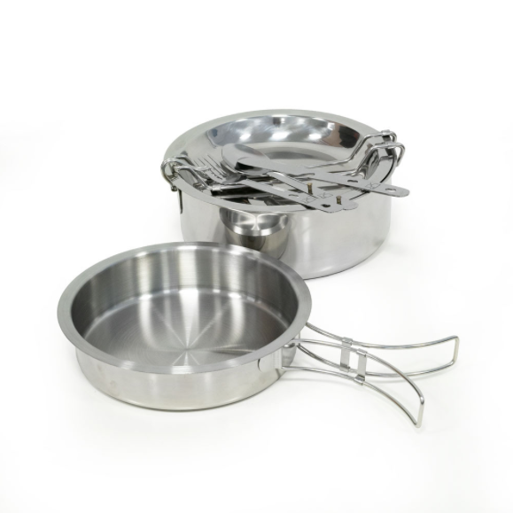 Topf, Pfanne, Teller, Gabel, Löffel, Messer und sogar ein integrierter Flaschenöffner finden sich in diesem Camping Kochgeschirr Set. Trotzdem lässt sich das ganze Set auf die Größe des Topfes zusammenpacken, denn darin kann man alles verschachteln. Am Ende kannst du die Griffe noch umklappen und schon sind auch alle Teile fest gesichert – dieses Camping Kochgeschirr Set ist platzsparend und praktisch zugleich.