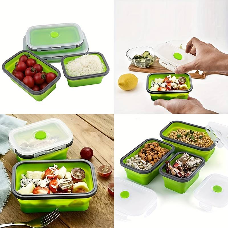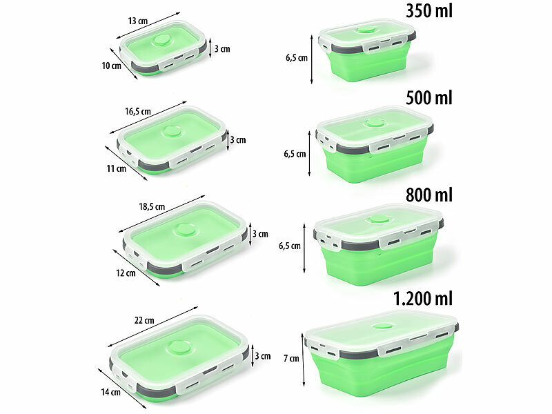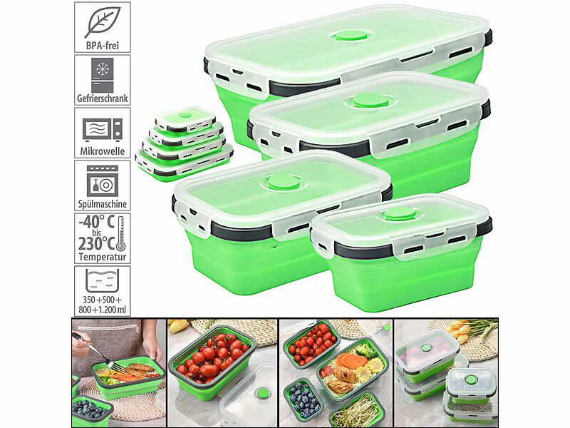Das Set besteht aus vier BPA-freien Silikon-Frischhaltsdosen mit 350, 500, 800 sowie 1.200 ml Inhalt. Ohne Inhalt lassen sich die Dosen zusammenfalten bei geringem Platzbedarf. Die Deckel schließen absolut luftdicht und halten auch Flüssiges zurück. Die perfekten Tourenbegleiter aus lebensmittelechtem Silikon sind perfekt für den sicheren Transport frischer Lebensmittel geeignet.