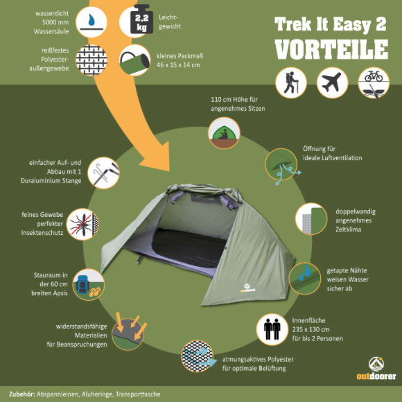 Trotz kleinen Packmaßes und geringen Gewichts ist das leichte Zelt stolze 235 cm lang, 130 cm breit und 110 cm hoch. Der Nutzraum wird durch das Abspannen der Webbings zusätzlich vergrößert. So ist das Trek It Easy ein ideales Zwei-Personen-Zelt. Der trapezförmige Vorraum (Apsis) umfasst eine Fläche von bis zu 60 x 240 cm und bietet somit ausreichend Stauraum für voluminöse Koffer, durchgeschwitzte Socken und härteerprobte Bikerboots. Kurzum: all die Dinge, die bei einer romantischen Nacht zu zweit stören würden.