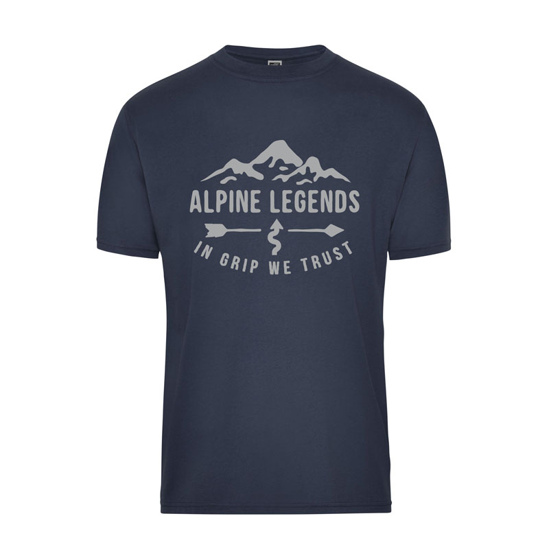 T-Shirts für reiselustige Abenteurer und Outdoor-Typen müssen einiges aushalten. Eine hochwertige Mischung aus gekämmter, ringgesponnener BIO-Baumwolle und robustem Polyester hat sich hierfür bewährt. So bietet dieses Shirt einen besonders hautfreundlichen Tragekomfort und vereint diesen mit der Funktionalität von Kunstfasern, weil es den Feuchtigkeitstransport von der Haut unterstützt und deutlich schneller trocknet als reine Baumwoll-Shirts. Der Halsausschnitt ist dank Elasthan und Necktape hochwertig und formstabil. Das Shirt ist in den Farben Stone und Navy erhältlich. Der großflächige Sublistop-Print auf der Brust sieht nicht nur gut aus, er ist auch ein Statement: ALPINE LEGENDS: IN GRIP WE TRUST!