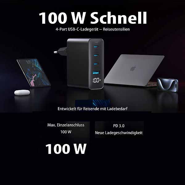 - Gesamt-Ladeleistung bei Verwendung aller Ports gleichzeitig: max. 100 Watt